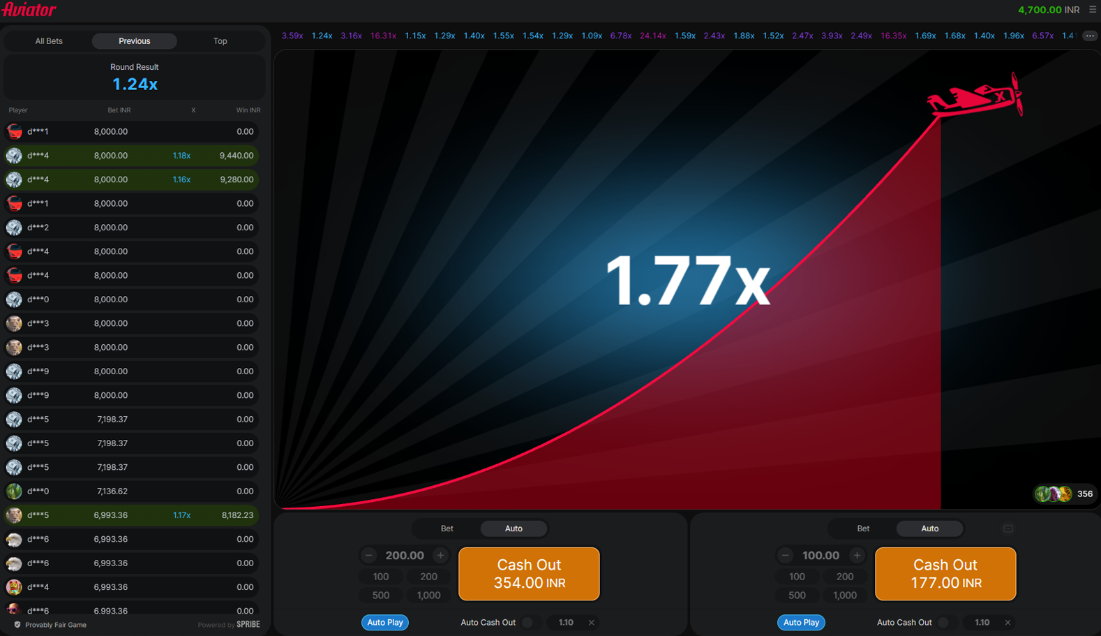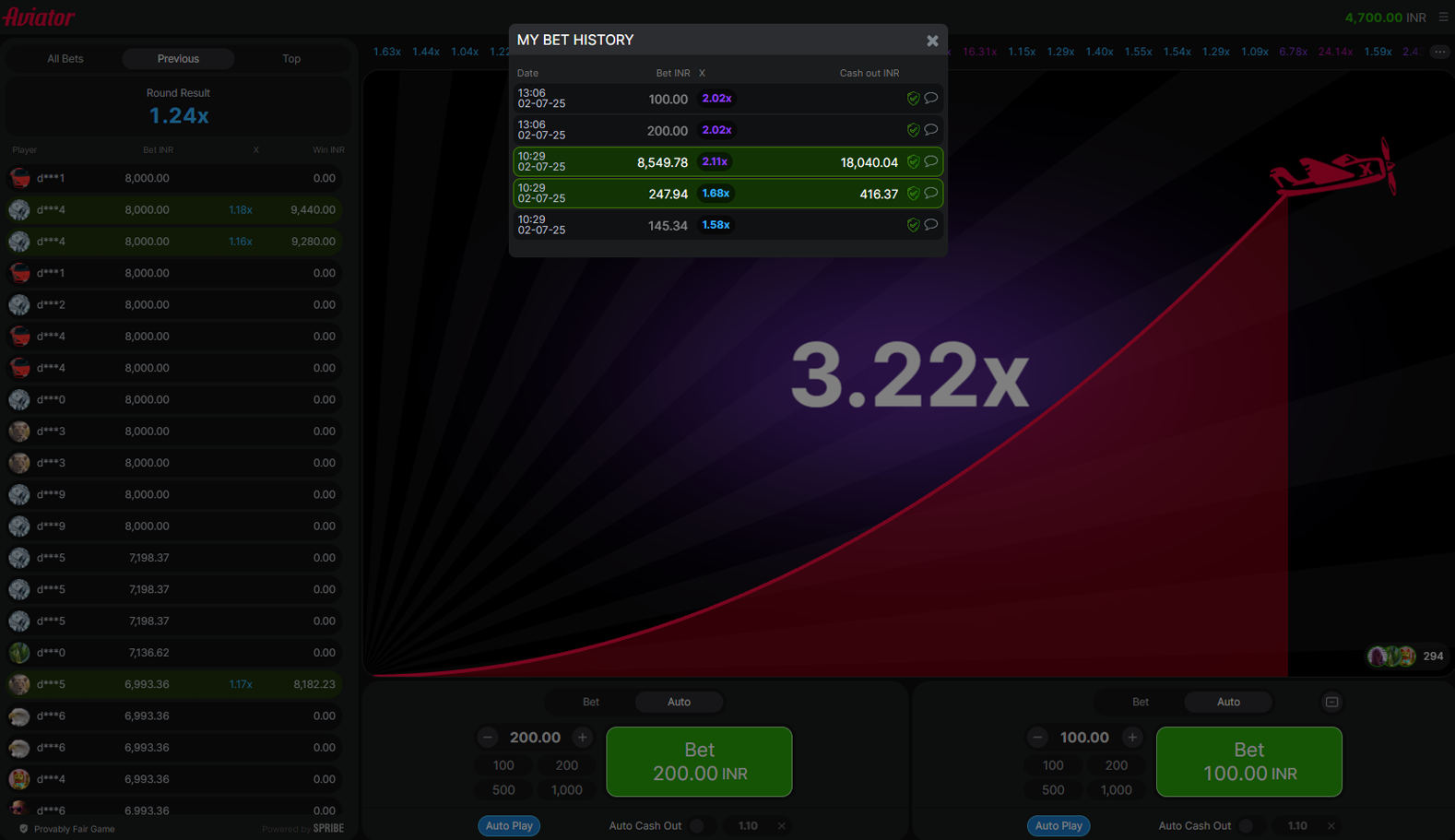 After launching the game, you may place bets during an active round. There will be a pause to let all Indian gamblers confirm their bets, so you must enter your bet amount within limits and click “Bet”. To diversify your strategy, you may place a second bet. Each can be cashed out independently. At any point in an ongoing round, manually click “Cash Out” at your chosen multiplier to lock in winnings.