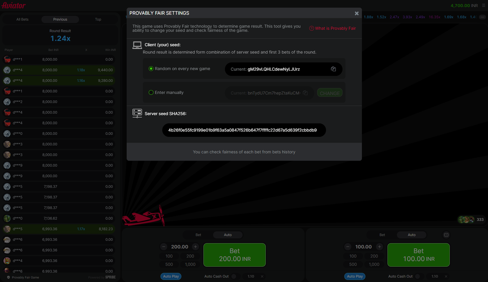 The cryptographic hashing-based Provably Fair method confirms the randomness of all outcomes and safeguards Spribe Aviator against tampering. Before a round, the game server generates a secret Server Seed and publishes its SHA-256 hash. Optionally, you can provide your own Client Seed (it’s generated randomly if you don’t do so).